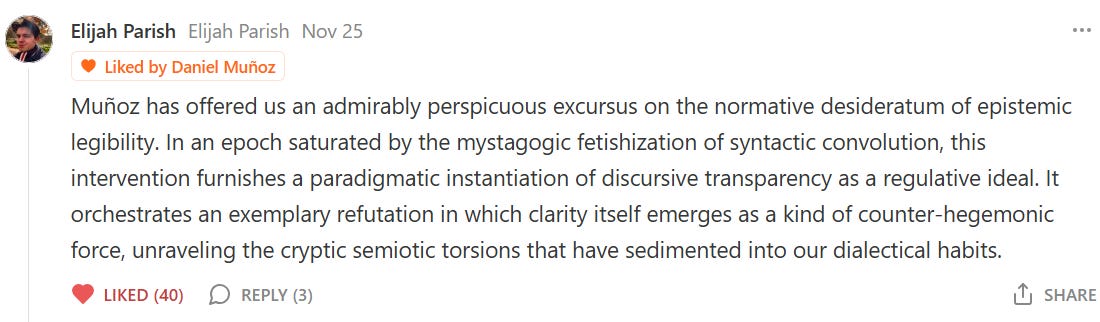 In my last post, I argued that clear writing is good. This sort of lurid, sensational claim is an example of what anthropologists refer to as “clickbait.” Naturally, the piece quickly became the most controversial thing I’ve ever written, inspiring several vitriolic replies, along with (if you can believe it) a few sympathetic comments and posts.