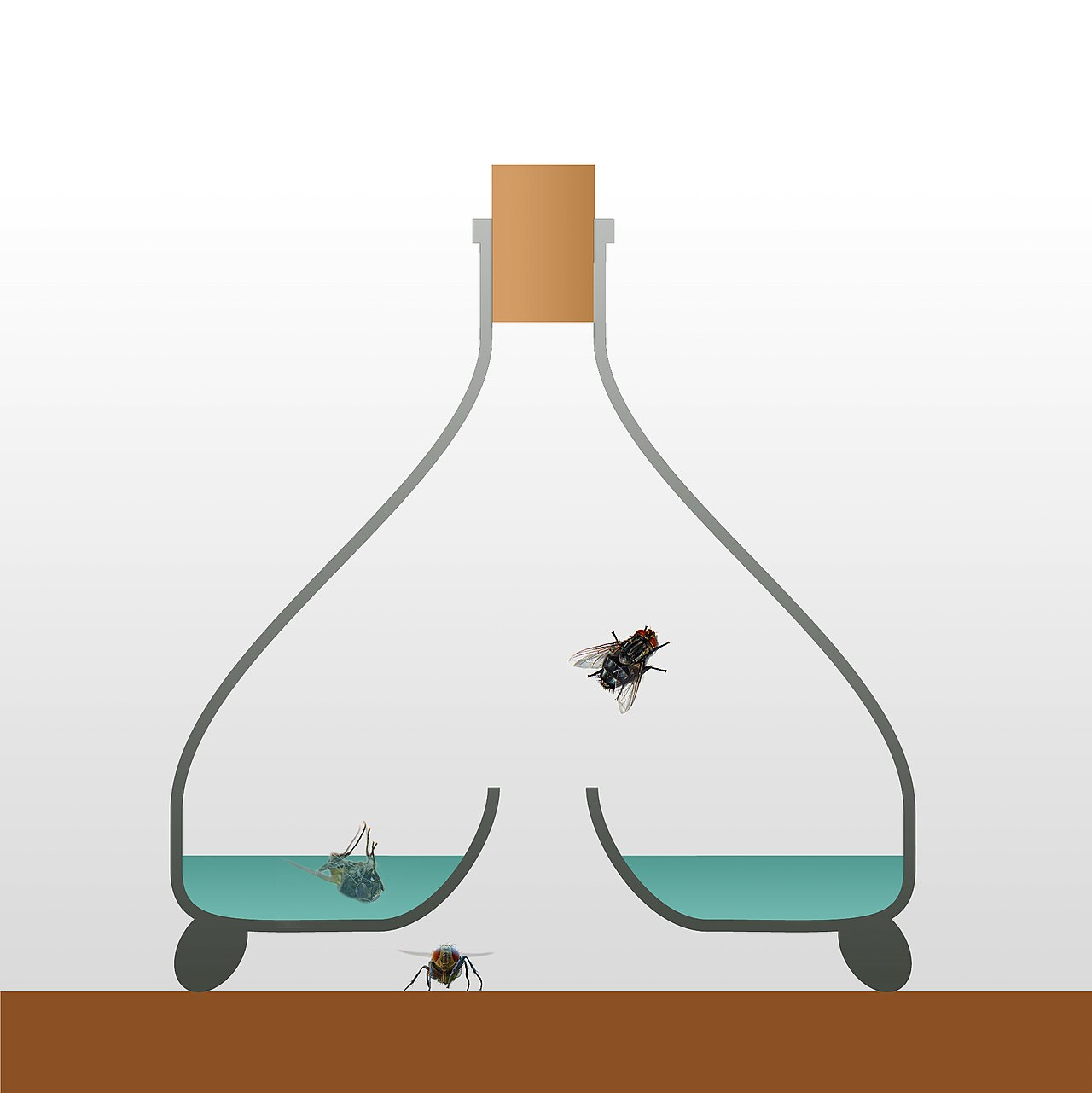 The point of a fly-bottle is not to store liquid but to trap flies—hence the more accurate name, “fly-trap.” People used to put some sugar water inside of a fly-bottle to tempt flies to enter from below. The flies, not being especially bright, would then try to leave through the top or sides. For the rest of their miserable lives, the trapped insects would beat themselves against the glassy walls of their prison, oblivious to the unguarded escape route below—even though they themselves had used this very same route to enter the trap not long before, lured in by the smell of sugar.